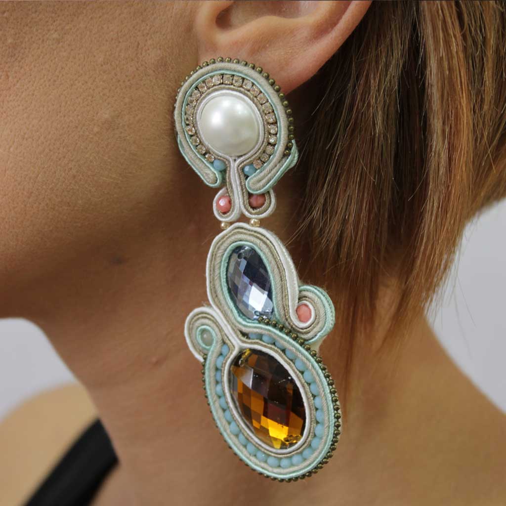Pendientes soutache Tallin, en colores cálidos y suaves. Destacan sus piedras de resina, perlas, cristal checo y detalles de cadena en oro viejo. Están bordados a mano con cordones de seda en color marfil y camel, envolviendo a sus abalorios de cristal checo en verde agua y a sus piezas centrales marrón y azul. La parte superior está trabajada con un centro de perla blanca y cristales checos en beige. El modelo Tallin es elegante, fresco y juvenil. Todos los diseños de RSÑO están cuidadosamente realizados a mano y son exclusivos de la firma.