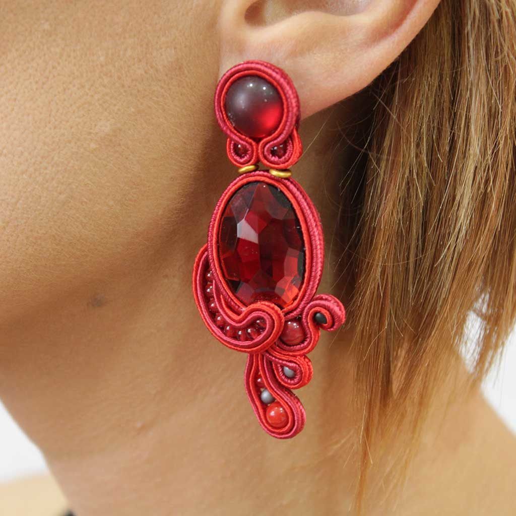 Pendientes soutache Zinnia, en color rojo. Estos aretes se componen de piezas centrales de resina y detalles en cristal checo en rojo. Todo ello envuelto con cordones de seda de primera calidad. Son una joya apropiada para llevar en infinidad de eventos como bodas, fiestas, cenas… Todos los diseños de RSÑO están cuidadosamente realizados a mano y son exclusivos de la firma.